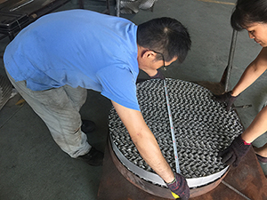 SM250型直徑為810的孔板波紋填料為半自動手工加工產(chǎn)品,質(zhì)量檢測人員核實孔板設(shè)計數(shù)據(jù),檢測孔板波紋填料的實際直徑。對技術(shù)人員提出保證峰高估算距離合理性的建議,對加工工人提出保證每片孔板長度的精確度達(dá)到±0.5mm。以保證產(chǎn)品符合合同要求,保證滿足客戶所需,保證產(chǎn)品質(zhì)量100%合格。