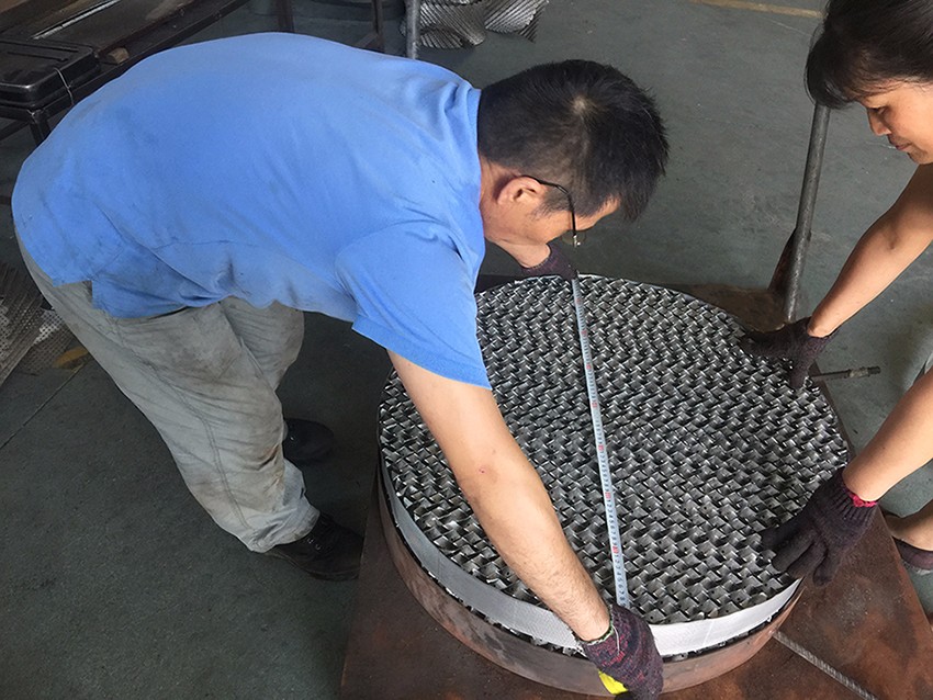 2017年7月間,氣溫高達(dá)40℃以上,在如此惡劣環(huán)境的情況下,我廠質(zhì)量檢測(cè)人員在加工工人的配合下頂著酷暑對(duì)我廠加工產(chǎn)進(jìn)行檢測(cè)。 我司規(guī)定,自動(dòng)加工產(chǎn)品是對(duì)產(chǎn)品質(zhì)量進(jìn)行抽檢,半自動(dòng)加工產(chǎn)品以及手工加工產(chǎn)品質(zhì)則需對(duì)產(chǎn)品質(zhì)量一一進(jìn)行檢測(cè)。 SM250型直徑為810的孔板波紋填料為半自動(dòng)手工加工產(chǎn)品,質(zhì)量檢測(cè)人員核實(shí)孔板設(shè)計(jì)數(shù)據(jù),檢測(cè)孔板波紋填料的實(shí)際直徑。對(duì)技術(shù)人員提出保證峰高估算距離合理性的建議,對(duì)加工工人提出保證每片孔板長(zhǎng)度的精確度達(dá)到±0.5mm。以保證產(chǎn)品符合合同要求,保證滿足客戶所需,保證產(chǎn)品質(zhì)量100%合格。